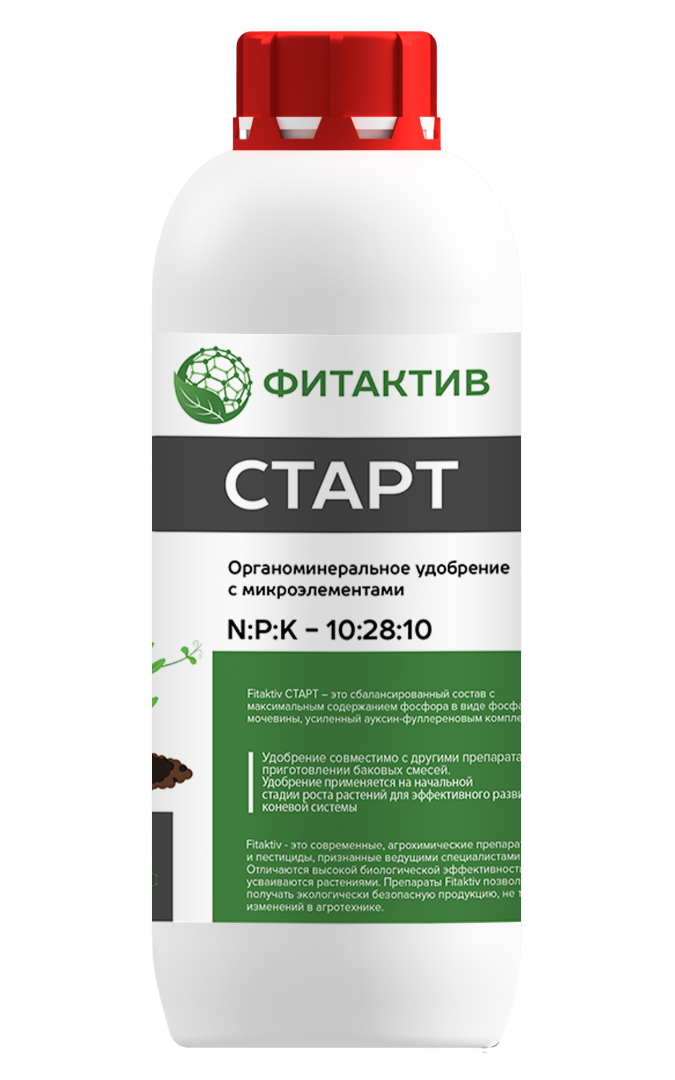 Фитактив Старт - применяется на начальной стадии роста растений. Содержит максимальное количество фосфора в форме фосфата мочевины, усвоение которого интенсифицируется за счет оптимальной дозировки группы витаминов В1, В6, РР и ауксин-фуллеренового комплекса.