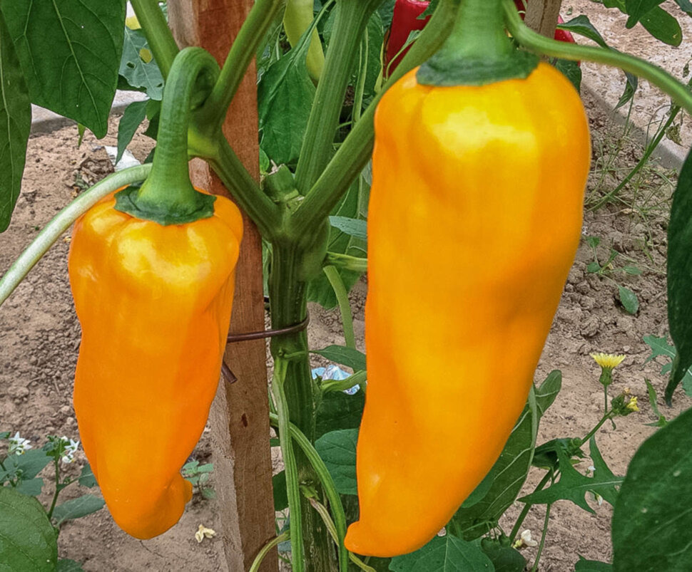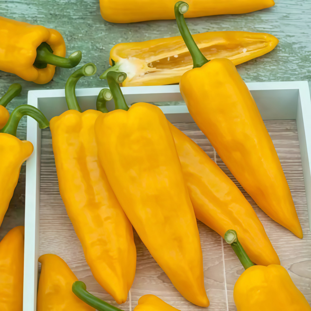 Перец "Бычий рог желтый" - это итальянский сорт сладкого перца с длинными (20 - 30см) плодами, напоминающими рог, которые созревают от зеленого к ярко-желтому цвету. Это среднеспелый, высокоурожайный сорт с сочной мякотью, идеально подходящий для запекания, гриля, фарширования и салатов благодаря сладкому фруктовому вкусу.